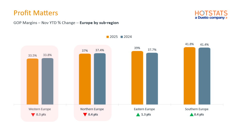 Beneath the headline number, however, regional margins diverge clearly. Southern Europe continues to lead with a GOP margin of 41.8%, remaining stable year-on-year. Eastern Europe has improved to 39.0%, an increase of 1.3 percentage points. Northern Europe reports a GOP margin of 37.0%, down 0.4 percentage points, while Western Europe records the lowest margin at 33.5%, down 0.3 percentage points and still below pre-pandemic levels.