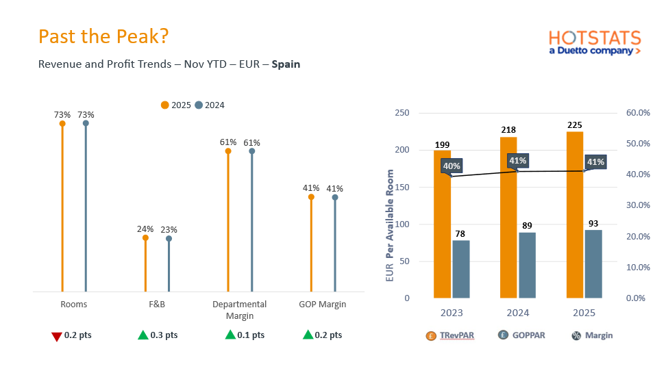 “What we’re seeing across Europe — and very clearly in Spain — is that revenue performance alone is no longer enough to explain success,” said Juan Gallardo, Director for Hospitality Intelligence, EMEA at HotStats. “As markets stabilize, profitability is increasingly shaped by margin discipline, labour management, and cost control further down the P&L. Small movements in these areas can have a big impact on overall performance.”